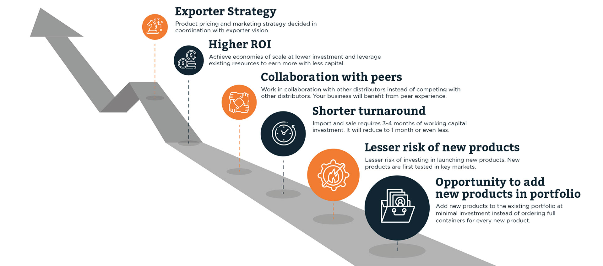 We overlook all legalities to save time and efforts of local distributors with limited reach. Through our platform, the master distributor will manage and supervise the local distribution and brand growth. We ensure optimal use of limited capital of the Distributors by getting access to wider range of import products.